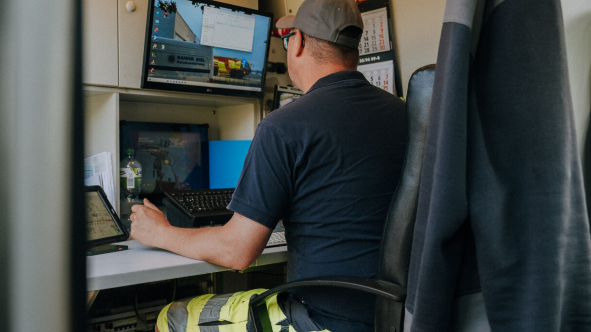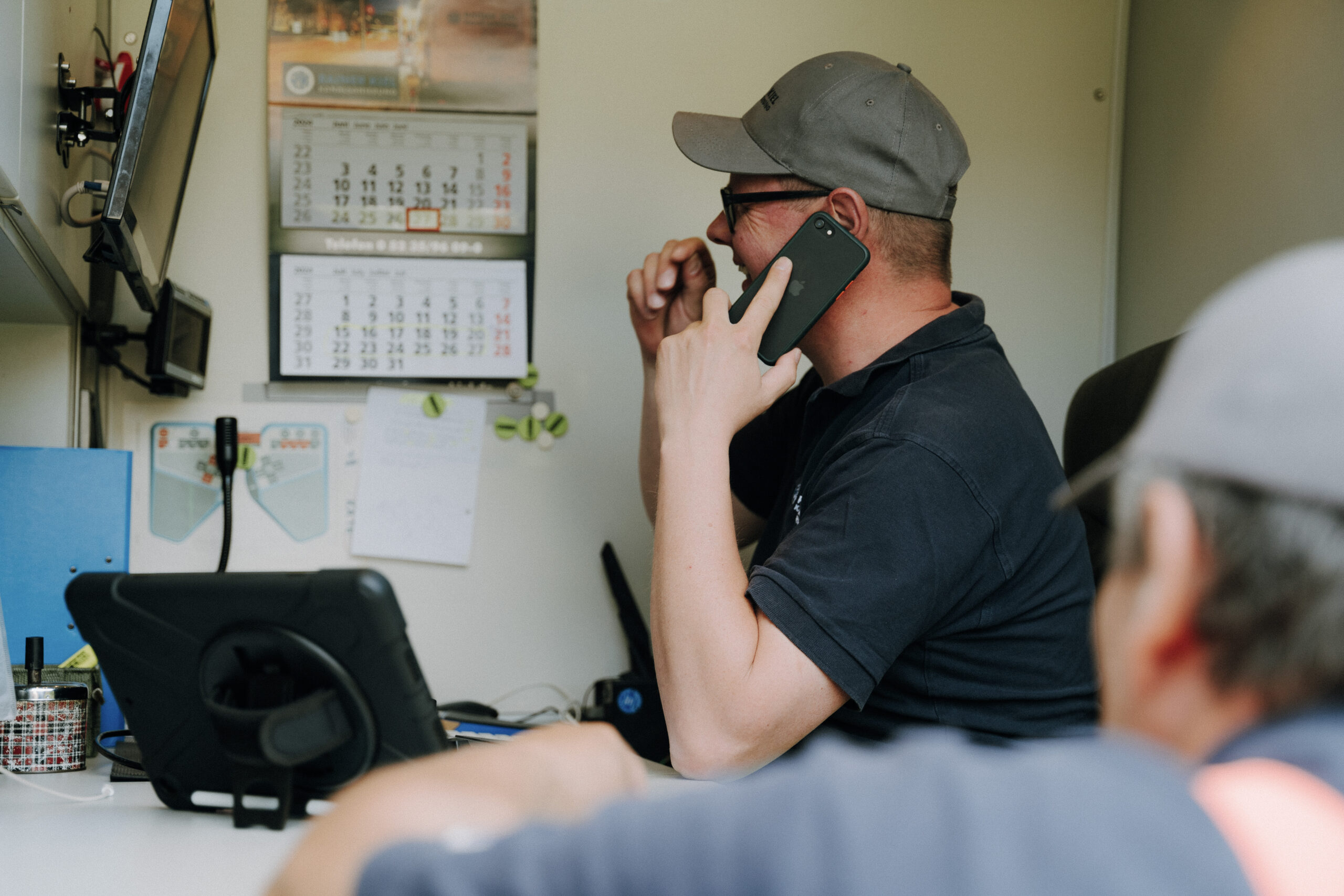 Im Bedienraum ist’s kurz ruhiger – draußen läuft die Sanierung, drinnen sitzt der Vorarbeiter am Handy. Am anderen Ende der Leitung: der Bauleiter. Es wird kurz abgestimmt, Zeiten geklärt, nächste Schritte besprochen und schon geht’s draußen weiter.