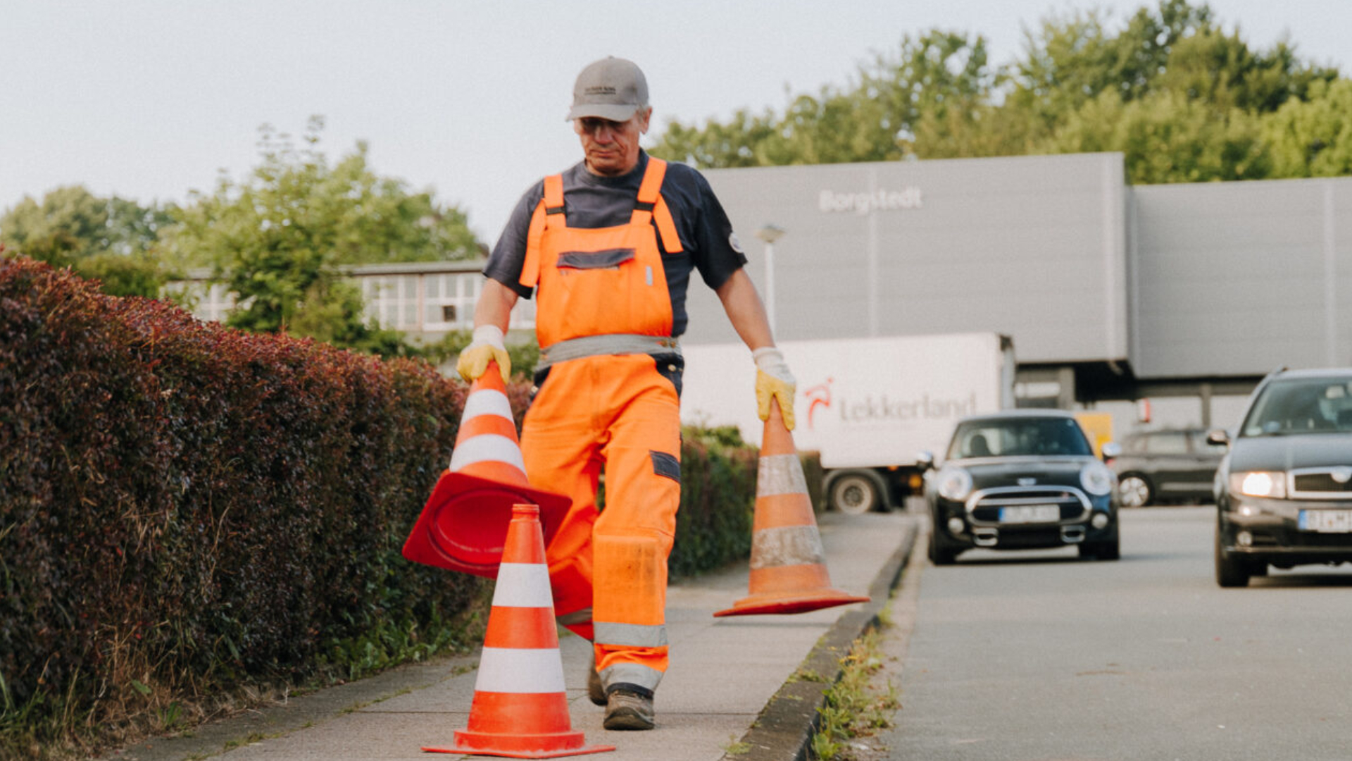 An der Baustelle angekommen, beginnt unser Tag mit dem Aufbau: Fahrzeuge richtig positionieren, Absperrungen aufstellen und Werkzeuge vorbereiten. Jeder im Team weiß, was zu tun ist – so greifen alle Handgriffe schnell ineinander.